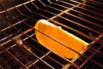 This is simple, makes a crisp, and slightly pliable tortilla that doesn't tear every time you fill it with food. Just fit your taco shell over the bars of your oven's wire rack. Bake in a preheated oven at around 350 degrees for about 10 minutes. That's it! Done!
